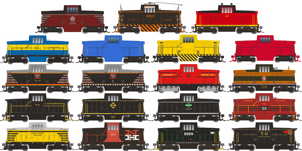 Road names: Burlington Northern; Chicago, Burlington & Northern; Claremont & Concord; Delaware, Lackawanna & Western; Erie; Great Northern; Greater Winnipeg Water District; Illinois Central; Lehigh Valley; Middletown & New Jersey; New Haven; New York, Ontario & Western; Pacific Electric; Penn Central; Strasburg RR; and Western Maryland.