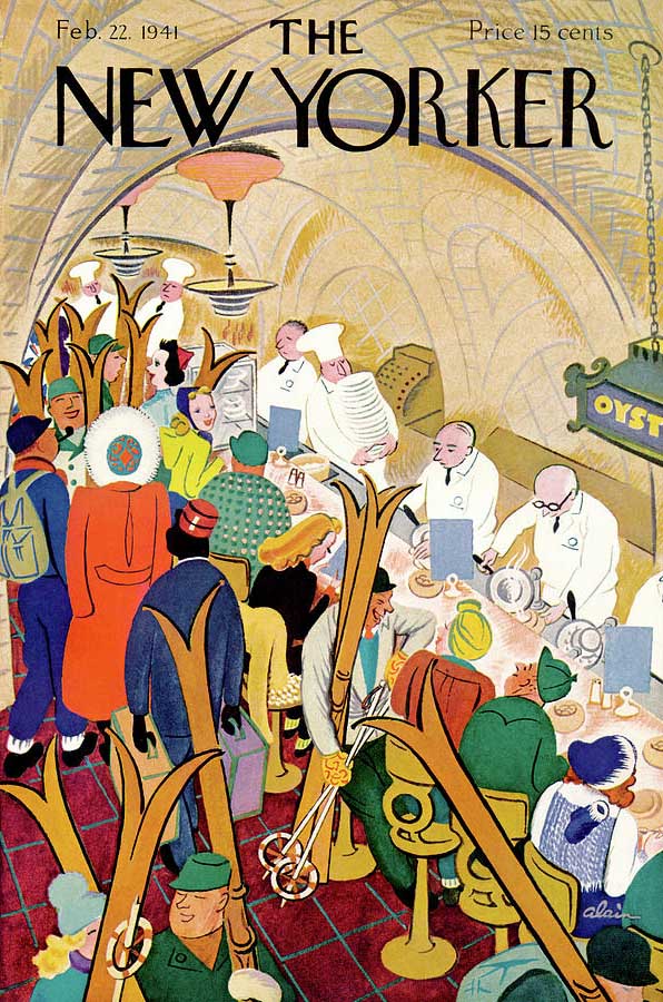 First known as the Grand Central Terminal Restaurant, at some point later it received its more famous name. The Oyster Bar gradually became part of New York lore. Celebrities frequented its bar, untold millions of travelers grabbed a bite to eat before grabbing a train for Poughkeepsie or Cincinnati, and, as if to officially sanctify the place, The New Yorkermagazine hired an artist to depict the restaurant for the Feb. 22, 1941, cover, featuring a lot of skiers obviously ticketed for NYC’s next train to Lake Placid.