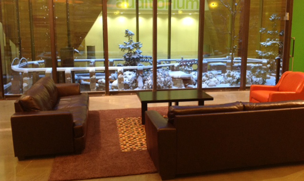 The light box already had a pond and water feature. The panes of glass and steel in the light box enclose a garden area with pine trees, shrubs, a memorial stone bench, mulch, and an 8-by-6-foot pond with three large water pillars and three lower spouts.