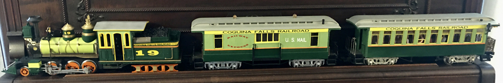 I spent the whole day loading and unloading old thread spools and small boxes from the log cabin to the flatcar, boxcar, gondola, and back again. Of all my 78 years, that Christmas remains my most memorable one. I was given the dining room to set up a train layout. I had this train from 1948-1959. This process started my love of trains and my desire to make them look real.