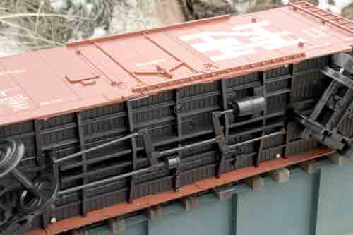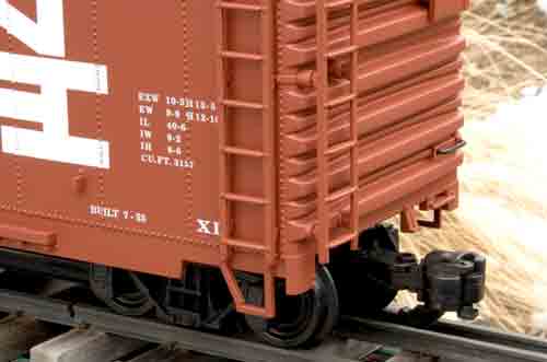 The cars roll freely on their deep-flanged plastic wheels, but you may wish to swap these for metal wheels with smaller, more prototypical flanges. (Aristo-Craft and other companies offer replacements). The trucks, wheelsets, and underbodies of these cars are molded in a shiny, black plastic. A little airbrush work will tone these down, making them more realistic and plausible.