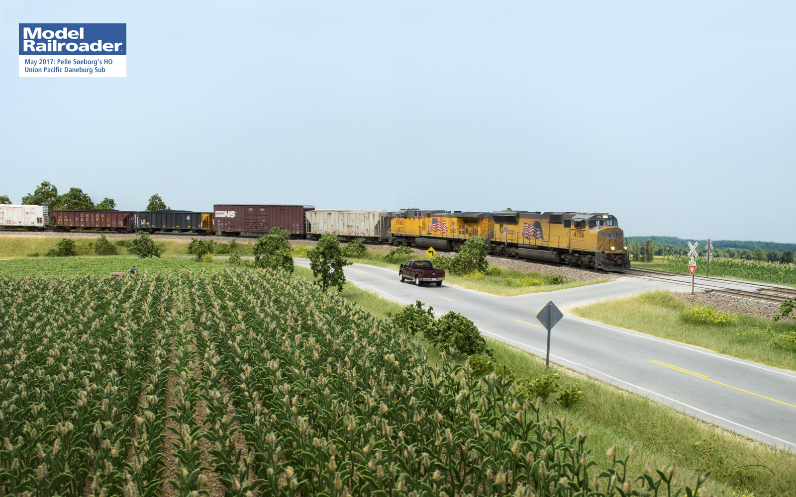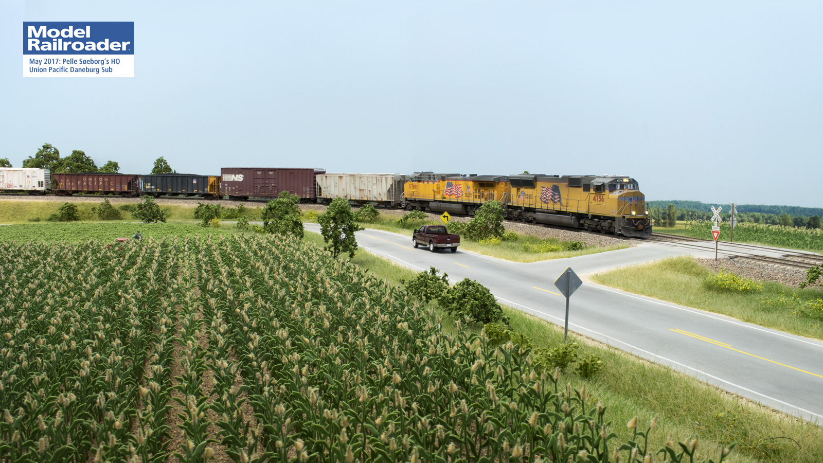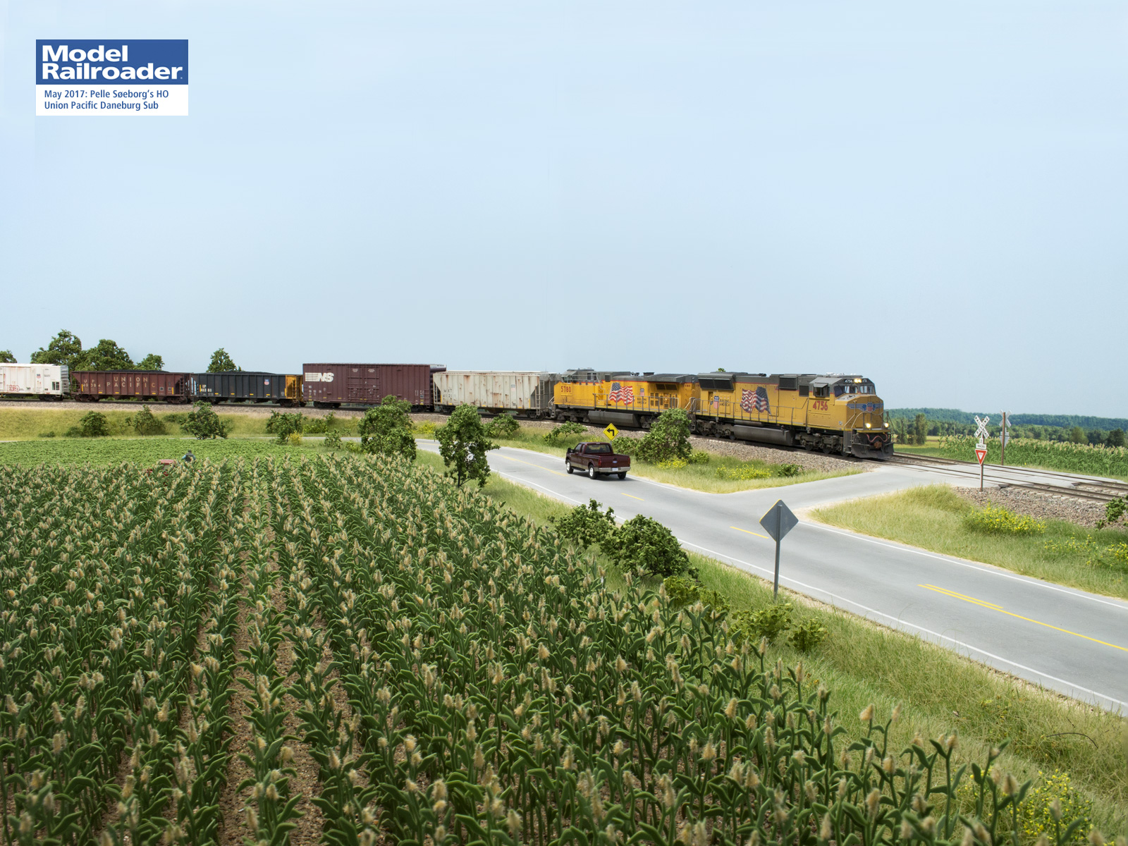 A Union Pacific freight rolls past a Midwestern cornfield on contributing editor Pelle Søeborg’s new HO scale Daneburg Subdivision model railroad. Click on the links below to download the image sized appropriately for your computer screen.
