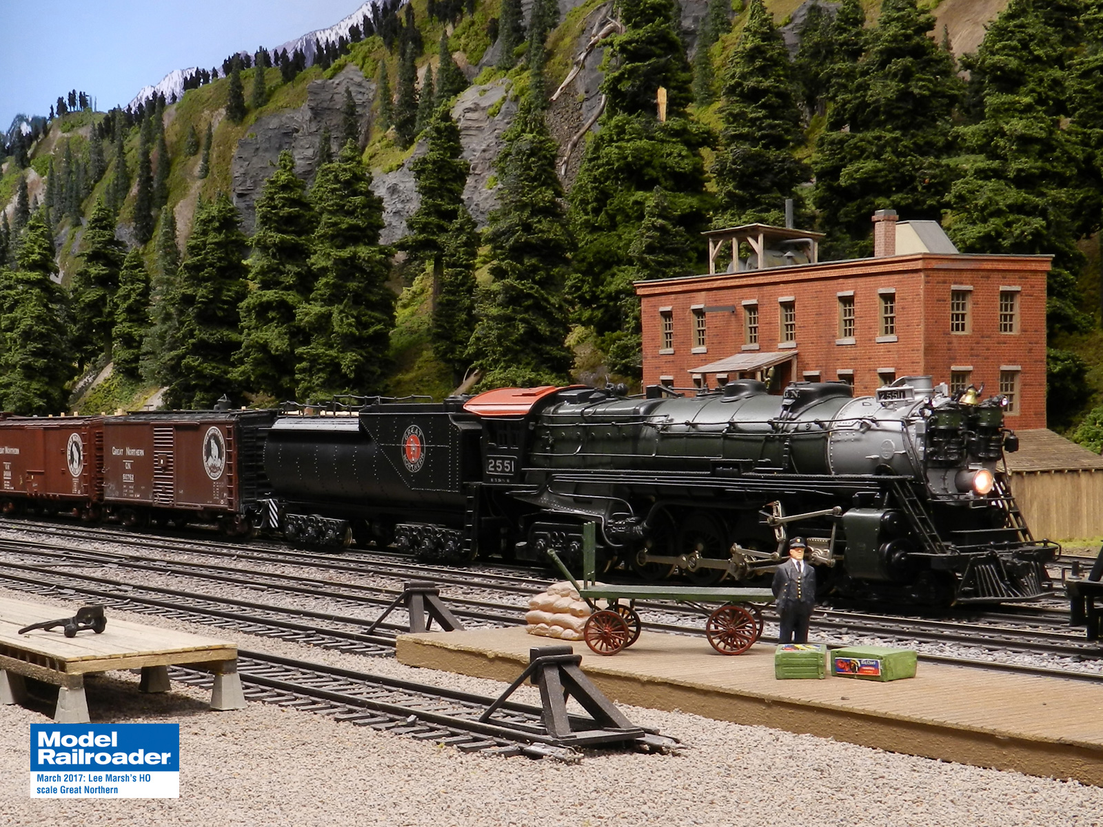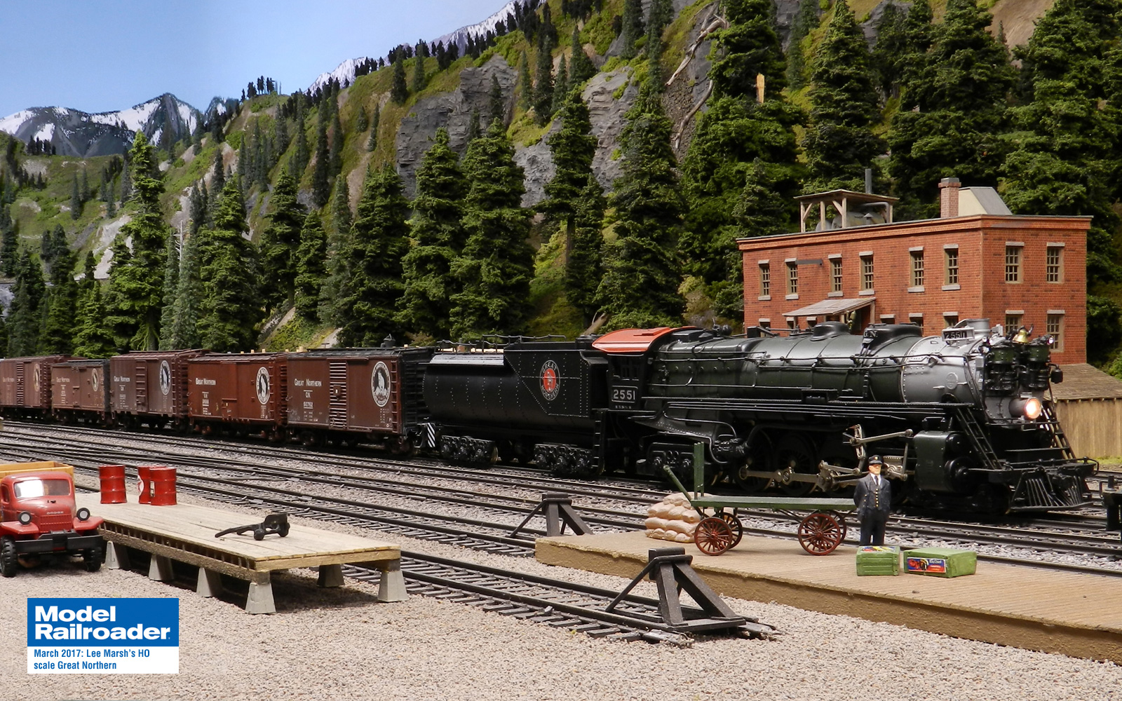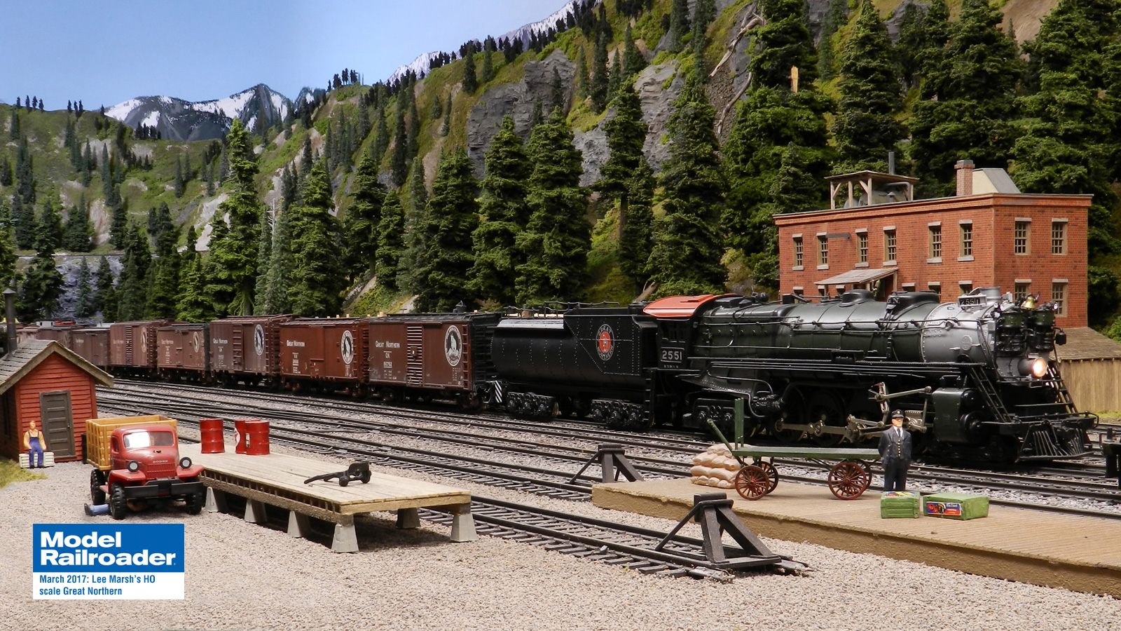 Marsh’s HO scale model railroad. Lee’s trackside photo is featured in the March 2017 Model Railroader. This month you can download the photo to use as computer desktop wallpaper. Click on the links below to choose the image size appropriate for your computer monitor.