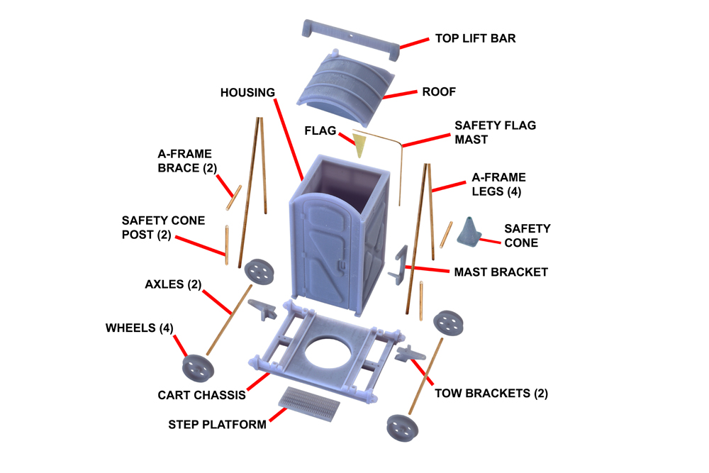 To 3-D print a rail cart porta-potty for your layout, download the files below, available in O, HO and N scale.