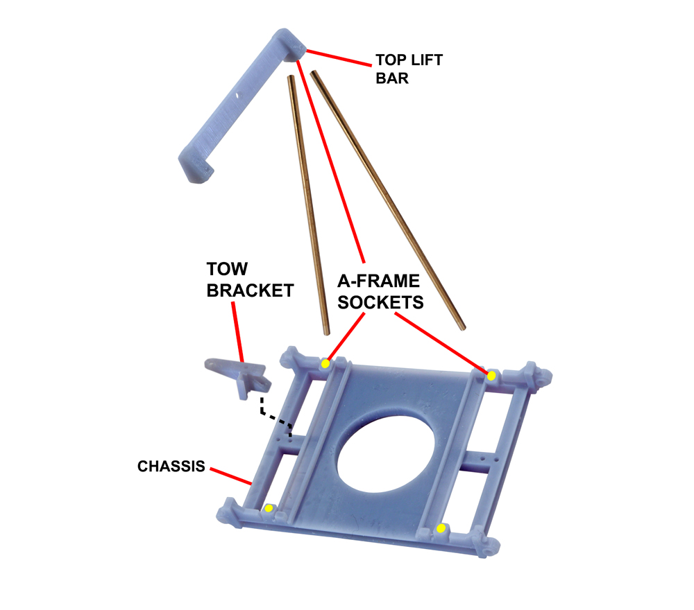 With all of the wires finished to an appropriate length, I was now able to assemble the cart, securing all joints with thin cyanoacrylate adhesive (CA). I began by installing the axles, wheels, tow brackets, and safety cone posts at each end of the chassis. The four bronze legs of the A-frame were inserted into the sockets on the chassis and top lift bar. I then checked the assembly for straightness and used CA to bond the dissimilar materials.