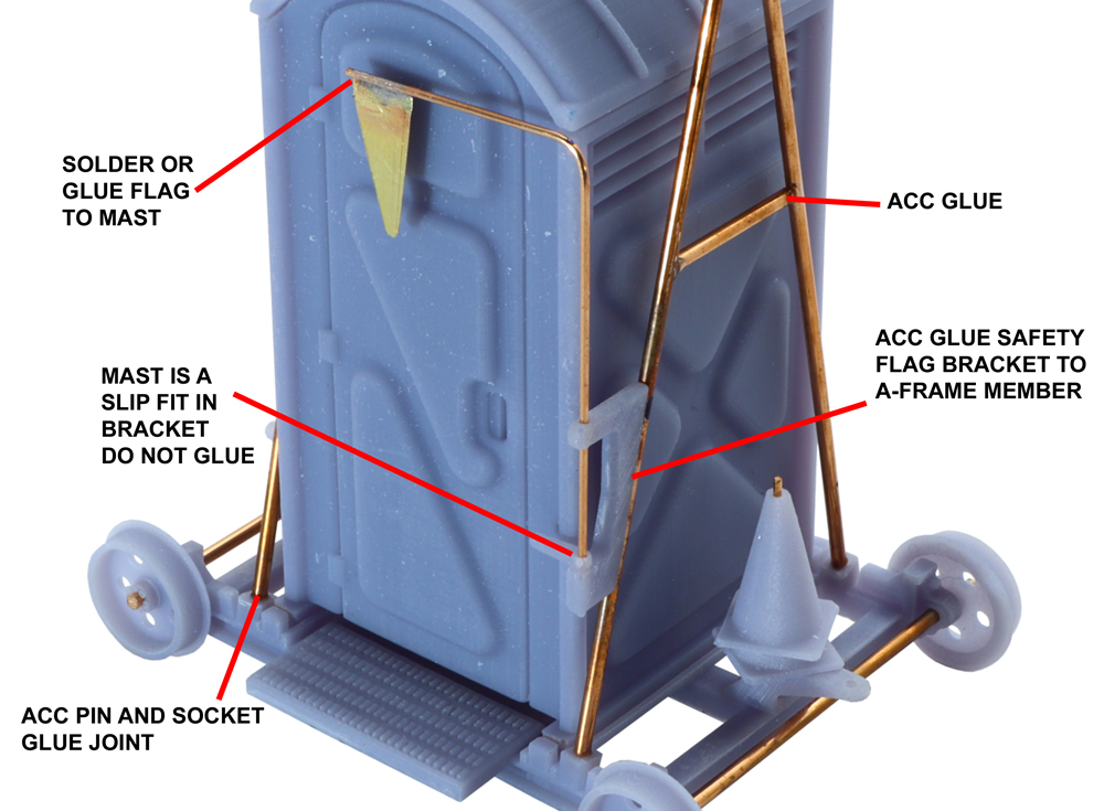The porta-potty house, minus the rail cart, can also be used as a standalone feature placed anywhere near an industry or construction site on your layout. Using this rail cart porta-potty is one sure way to help reduce any Occupational Safety and Health Administration violations that may occur during track maintenance on your modern era railroad.