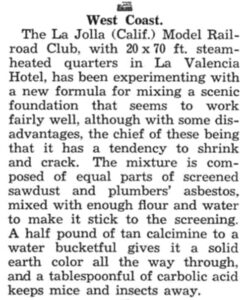 In the November 1940 issue, in the “Along the Division” column, the La Jolla Model Railroad Club suggested a recipe for a scenic foundation that included asbestos, sawdust, and a tablespoon of carbolic acid “to keep the mice away.”