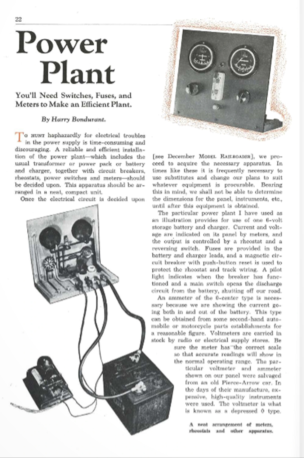 Today’s hobbyists have many choices for power supplies for their locomotives, but in the early days of model railroading, modelers had to get creative. I found several do-it-yourself references to building power supplies and/or charging systems.
