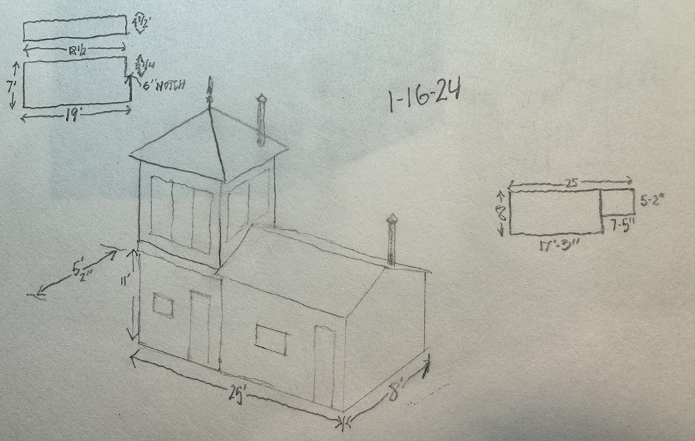 I’ve got a couple of places on my layout where I could still use a yard office, so I figured the Atlas elevated gate tower would be a good starting point. I spent a little time drawing up ideas and came up with a rough plan to combine the tower with an all-new lower structure. You don’t need to have architectural-level drawings to do a kitbashing project like this, but it’s good to have an idea of what you want to complete, as well as work out the key dimensions ahead of time. You’ll notice from the sketch, I did make some alterations as I worked, including omitting one of the doors.