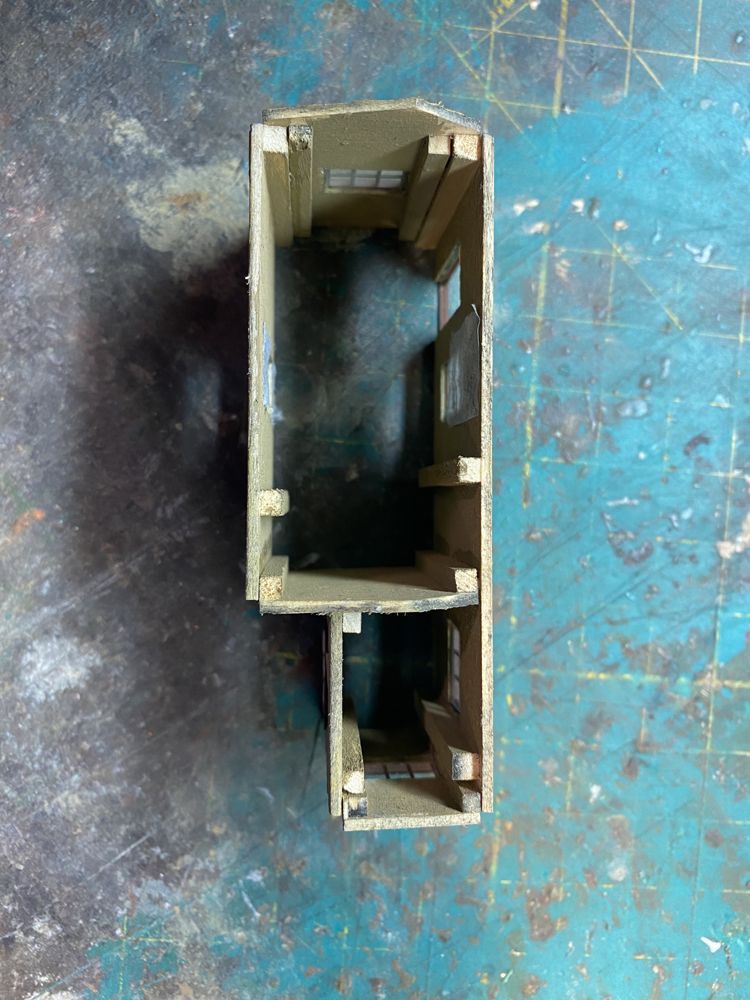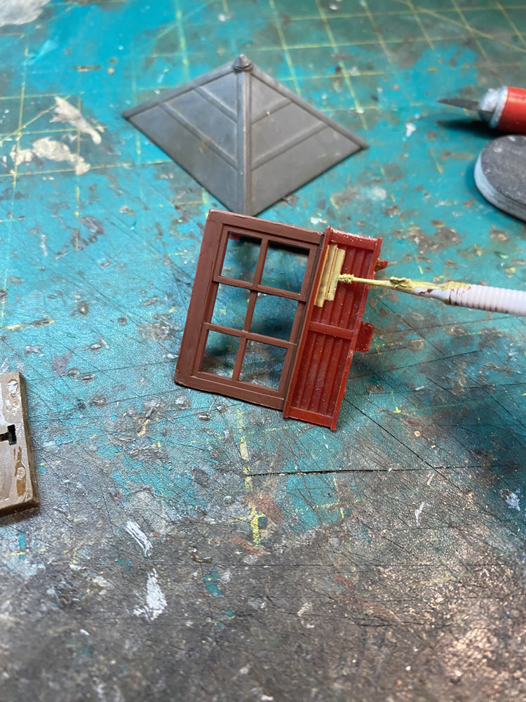 I used mostly what I had on hand for this project, and that included the paint. I painted the tower’s exterior walls (and later the tower office walls as well) with Polly Scale Depot Buff. I used Polly Scale Freight Car Red for the windows and trim. While these paints are no longer available, you can find similar colors in acrylic paints offered by Vallejo, Mig Acrylics, and others.