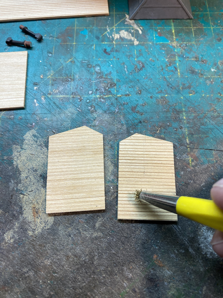 Since I like my layout structures to look a little weather-beaten, I distressed the wood walls using three different techniques. I started by using a brass bristle scratch brush to roughen the finished surface of the wood. To do this, lay the part on your work surface and scrub the brush along the wood parallel with the siding. I like doing this before I cut window openings because it’s easier to work on the wood pieces with a solid surface. When the wood is later painted or stained, the rough surface will take on an aged wood look.