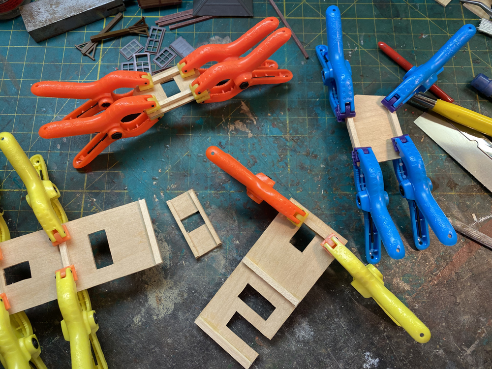Next, I assembled the wood wall sections. I started with the front wall, adding the short end wall, and I continued building the structure from there. I used a small machinist square to make sure the walls stayed square. While gluing the walls together I left a notch where the walls meet at the corner so that I could add HO scale 6 x 6 stripwood for the corner trim later. It’s much easier to paint the trim pieces separately, then add it after the walls are assembled.