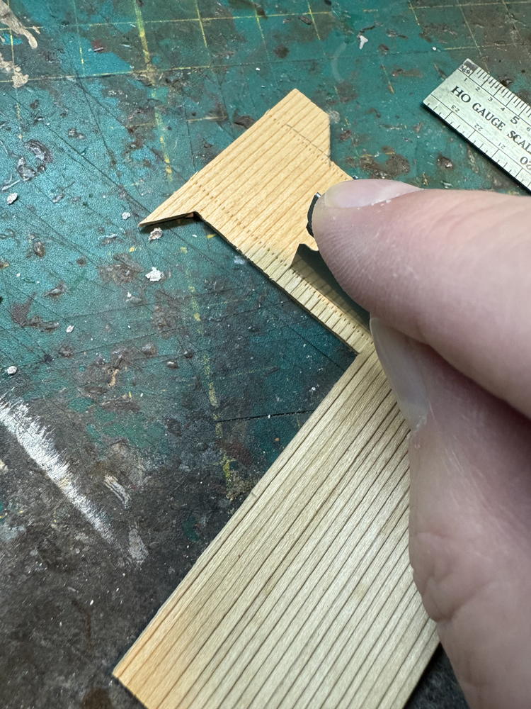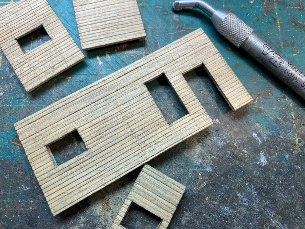 Before doing any other distressing work, I cut the window and door openings in the walls. Once this was done, I cut the openings for the window castings. The wall on the narrow end of the tower split as I cut the window opening. If this happens to you, don’t worry, as it is a common problem when cutting wood parts near an edge on a small piece. To fix it, I put a small dab of wood glue on the two halves where the piece broke, then I added a 3/64” square wood brace on both sides to hold it.