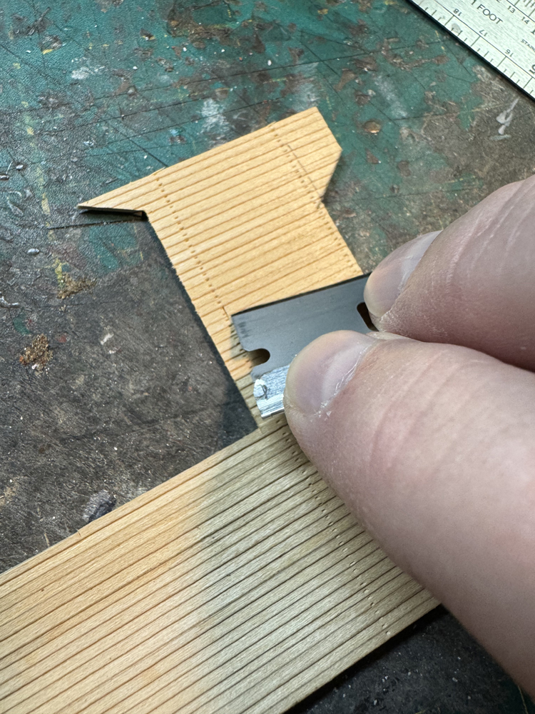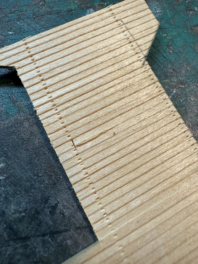 With the windows cut and the walls braced, I returned to my distressing techniques. I used a pounce wheel (shown in the photo) to make nail holes in the wall sections. Mine is a Vintage Reproductions brand pounce wheel, but you can buy this type of tool on Amazon.com or at most any craft store, and they are very easy to use. To make the holes, set a straight edge vertically along the wall where you want a row of nails, then carefully roll the wheel along it to form the holes in the soft wood surface. Nails would be used on the siding where the wall’s studs run behind the boards, so there is a pattern you should follow. Studs typically are spaced on 16” centers, but they also run alongside all door and window openings. A little goes a long way here, so no need to place lines of nails every 16”.