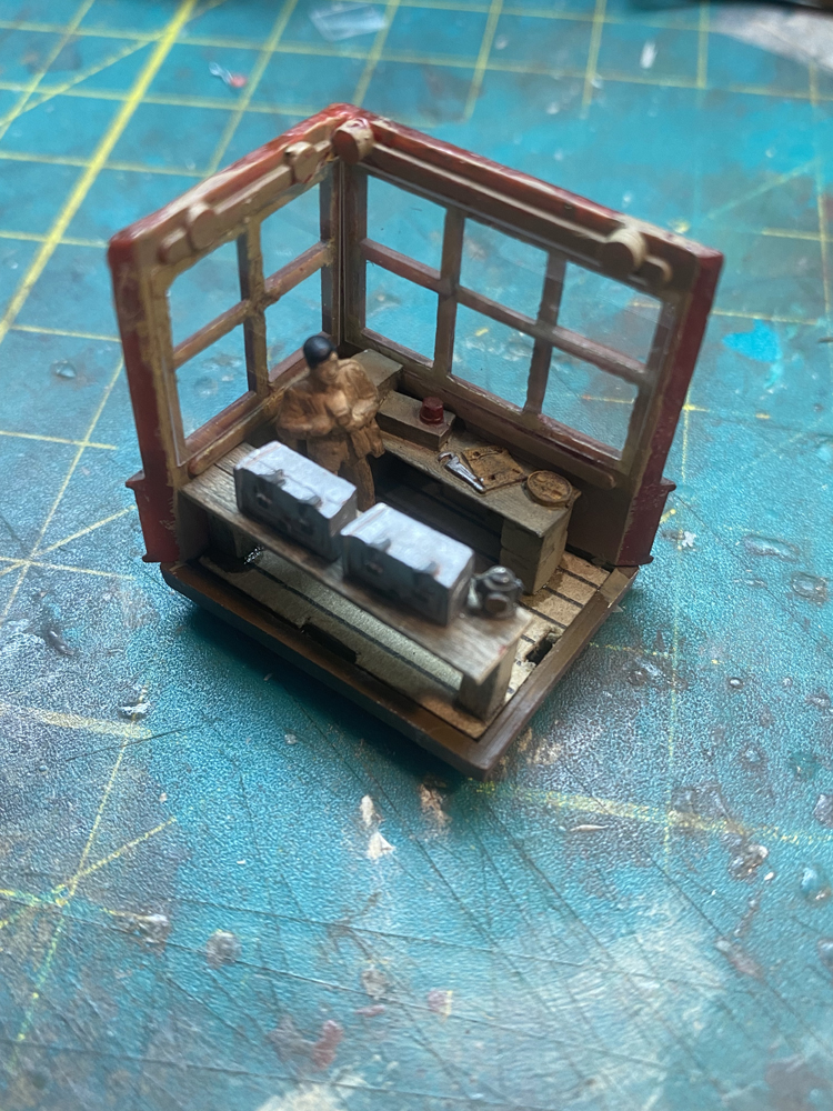 While you can easily omit the next step, my tower will sit near the edge of my layout. With those big windows, the interior will be seen easily, so I needed to put something in it. I partially assembled the tower section, including adding a new wood-plank floor, and then I spent some extra time installing a few details to the inside. I built most of the furniture myself from scraps, including a desk and equipment bench. I then added some simple detail castings from my collection of spare detail parts, as well as a figure.