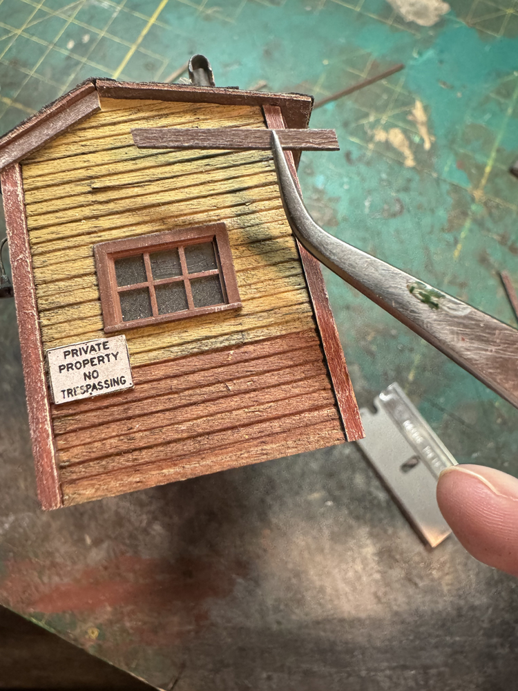 With the adhesive in place, I then applied strips of black construction paper that I’d sprayed a light coat of gray paint to represent rolled roofing. I like using black construction paper because I don’t have to paint the edges after its cut.