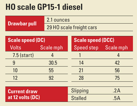 All of the model’s metal wheels are chemically blackened. None of the wheels have traction tires, yet the GP15-1 still has enough power to pull 34 HO freight cars on straight and level track.