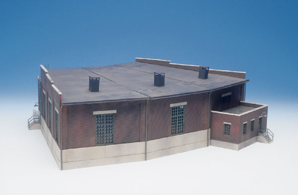 This kit is based on a number of Delaware & Hudson prototypes, although it looks like any one of hundreds of roundhouses built during the golden age of steam. With its concrete trim and foundation and brick walls, the building looks like a small Class 1 roundhouse, not something used by a rinky dink short line.