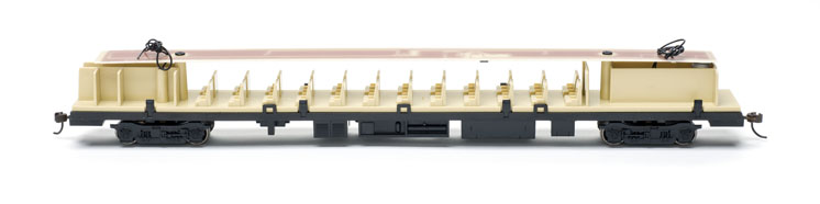 The window arrangement matches PRR drawings on Rob’s Pennsy home page at www.prr.railfan.net, and the Pullman-Standard drawings, except the rear-most windows on the observation end of the car are about 6″ short, creating more space between the windows and the rear door than on the prototype. The trucks are the correct wheelbase.