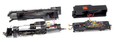 An automatic dual-mode DCC decoder is concealed inside the tender and connected to an NMRA eight-pin socket. Six wires connect the tender to the locomotive; the decoder offers directional lighting control but no sound. There’s sufficient space within the tender to substitute a DCC sound decoder, but the speaker would probably have to go in the coal bunker.