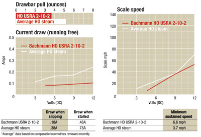 On DCC, the 2-10-2’s speed range was nearly identical to its DC performance, except for an amazing slow speed. It started moving at a barely perceptible .3 scale mph; this was so slow that we had to stare at a tie to see the locomotive move!
