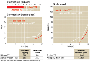Using an NCE Powercab DCC system, I ran the model in speed step 1 at 1 scale mph. The locomotive accelerated to a top speed of 57 scale mph at speed step 28, which is close to the prototype’s top speed of 60 mph. The BLI class TTT also supports 128 speed steps for more precise speed control.
