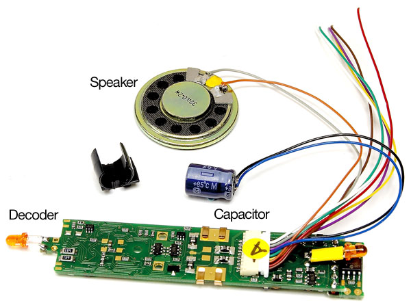 The 28mm speaker snaps into the speaker enclosure that’s mounted in the locomotive’s fuel tank. The decoder also includes a 330µF capacitor, wired to the speaker. Digitrax supplies a plastic holder for the capacitor, allowing it to be easily clipped to the locomotive’s frame directly over the rear truck. Everything went together easily, and the complete installation in a Kato AC4400 took about 20 minutes.