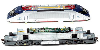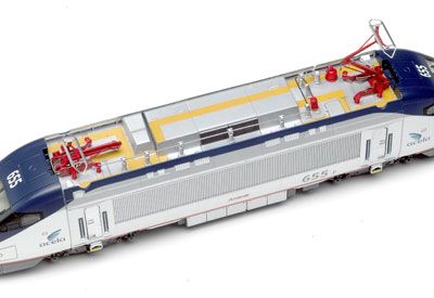The raised rectangular roof-vent cover on top of the model pops off to reveal a printed-circuit board. A socket is provided for installation of a Digital Command Control (DCC) decoder, and the model comes with a jumper plug installed for DC operation. There’s also a sliding switch on the board that changes the pickup from track to catenary. The raised pantograph operates in a range from 18 to 21 scale feet above the rails.