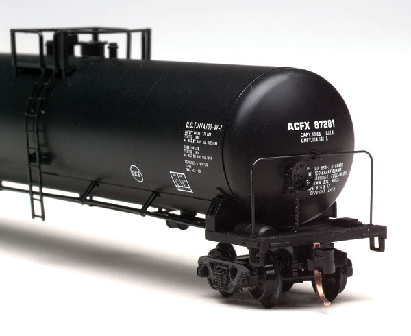 The model represents one of a lot of 1,370 tank cars that ACF built in mid-1974 at its Milton, Pa., shops and numbered 86567 through 87947. The federal Department of Transportation classified these cars as 111A 100 W-1.