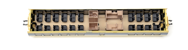 The interior floors are painted a yellow-tan color. The seats are painted blue. All the car windows are flush fitting and tinted, which looks very realistic when the interiors are illuminated.