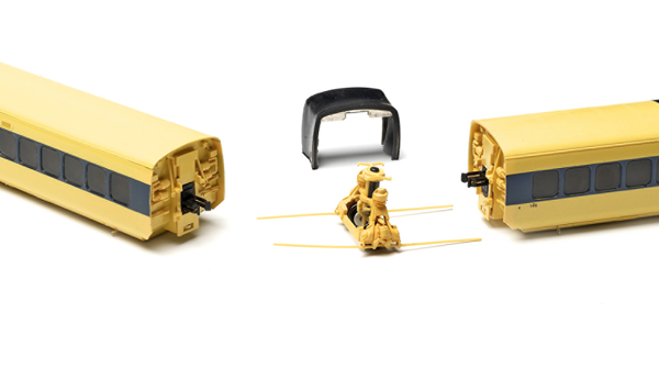 Setting up the train. Instructions for the multi-step process of coupling the train together as well as DC and DCC programming and prototypically operating the Turbo-Train are included in the extensive owners’ booklet. Setting up the TurboTrain is more labor intensive than most passenger train models. You need to insert the guidance rods into eye bolts and make sure that each car is oriented correctly before attaching the upper and lower coupler to each center truck. The diaphragms between cars are separate pieces.