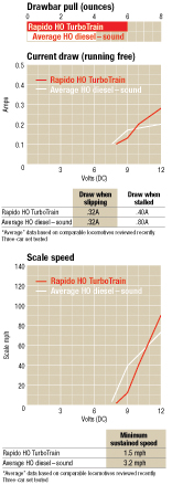 Speed tests. I tested the TurboTrain in DC using a 12V power pack. Lights and sounds started at 7 volts. The model had a starting speed of 1.5 scale mph at 8 volts and a top speed of 90 mph at 12 volts, which is below the top speed of the prototype. For higher speeds in DC, the manufacturer recommends using a 16V power pack.