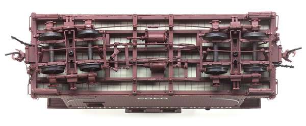 The model rides on the proper 43″-wheelbase archbar trucks fitted with National Model Railroad Association RP-25 contour metal wheels. Models are available with wheelsets gauged for either On3 or On2½.