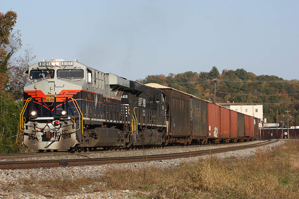 Norfolk Southern ES440AC No. 8101, honoring the heritage of the Central of Georgia Railway, leads westbound train 66E through Old Fort, N.C., on Oct. 19, 2012. Photo by Grady McKinley […]