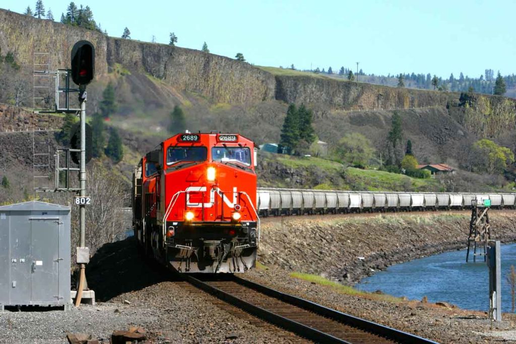 Canadian National power leads a westbound BNSF grain train through the Columbia River Gorge on April 1, 2013. Photo by David Lassen […]
