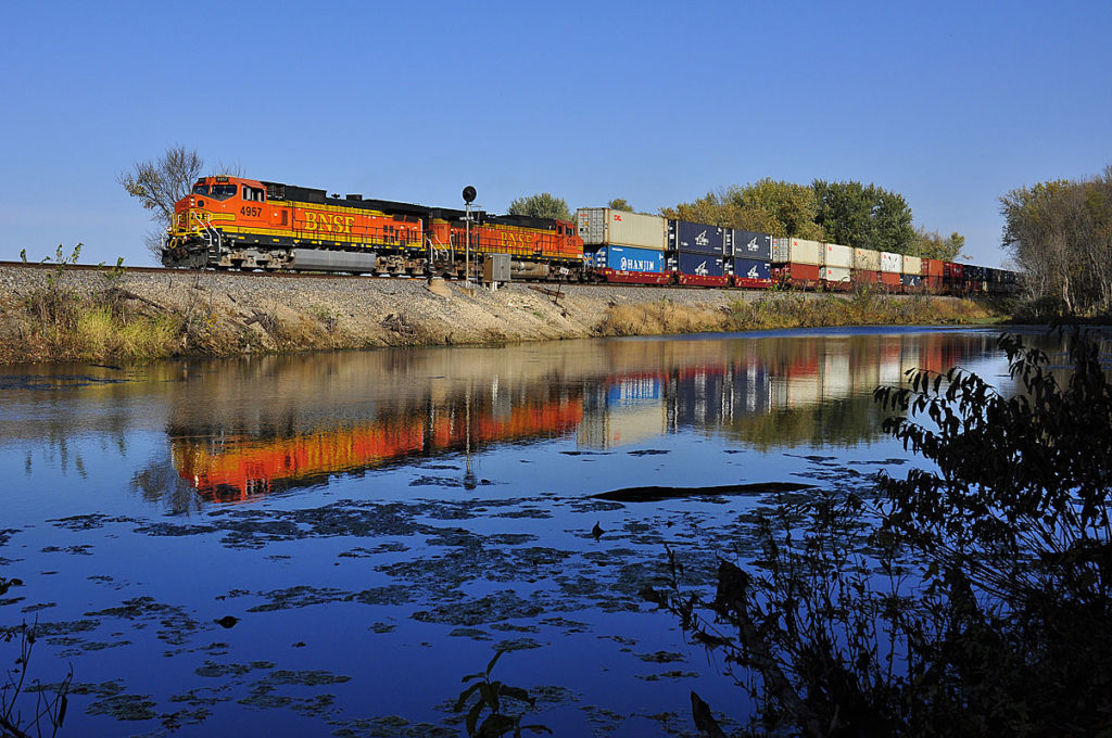 BNSF Railway C44-9W No. 4956 leads an intermodal train east along the Mississippi River near Galena Junction, Ill., on Oct. 16, 2010. Photo by Steve Bauer […]