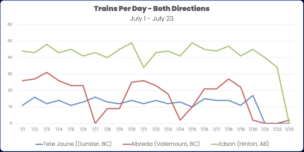 RailState has a sensor at Hinton, Alberta, on the Edson Sub, where it has recorded an average of 44 trains per day recently. The last train to pass Hinton was a westbound grain train at 11:22 p.m. on Monday. The grain train was among those being held east of Jasper.