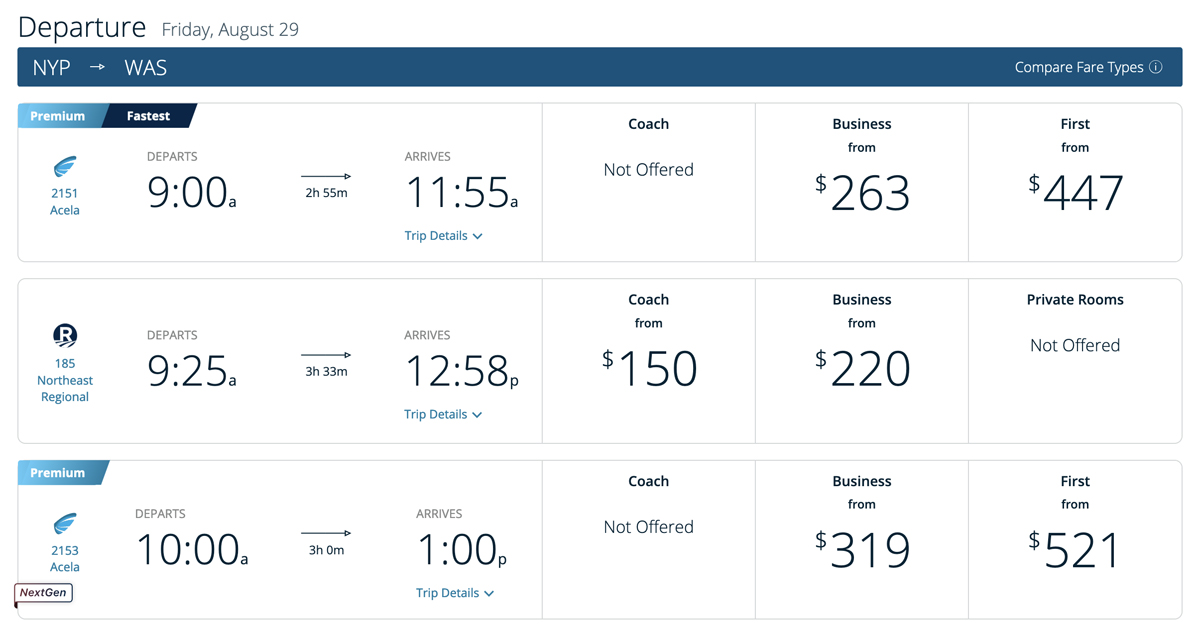 NEW YORK — Amtrak is now offering tickets on Northeast Corridor trains that will debut the long-delayed NextGen Acela trainsets, and has announced which trains will feature the equipment, as well as highlighting those trains with a “NextGen” icon on the booking portion of its website and app.