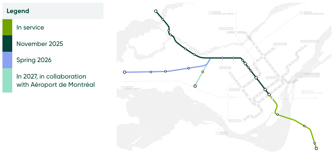 MONTREAL — The second portion of Montreal’s Réseau express métropolitain light rail network has opened, with regular service on the Deux-Montagnes line beginning at 5:30 a.m. ET today (Nov. 17, 2025). That follows a Friday ceremony that included Prime Minister Mark Carney and a weekend of free “open house” operations on the new 33-kilometer (20.5-mile), 14-station branch.
