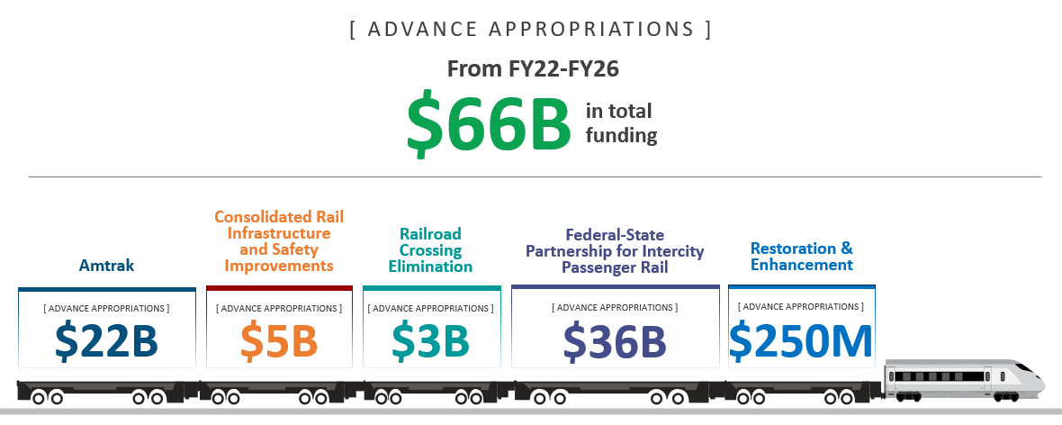 Included in that total through fiscal year 2026: $22 billion for Amtrak, $5 billion for CRISI grants, $3 billion for railroad crossing elimination, and $36 billion in federal-state passenger partnerships.