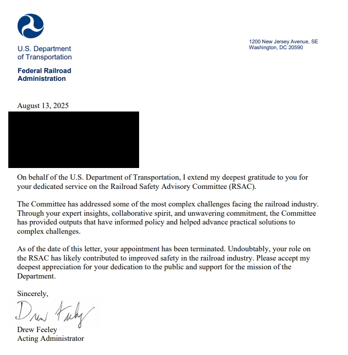 “As of the date of this letter, your appointment has been terminated. Undoubtably [sic], your role on the RSAC has likely contributed to improved safety in the railroad industry. Please accept my deepest appreciation for your dedication to the public and support for the mission of the Department.”