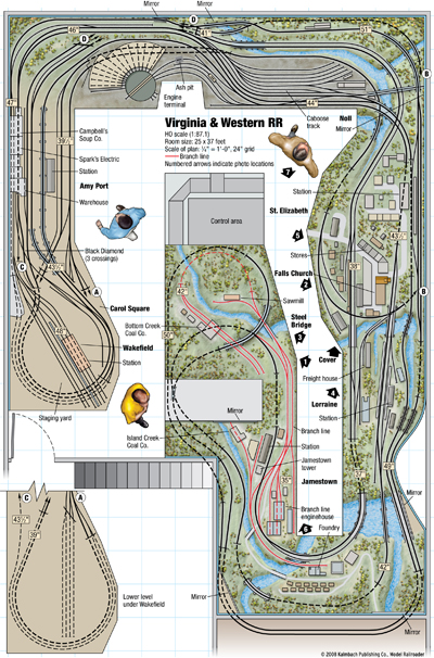 Track plan at a glance Name: Virginia & Western RR Scale: HO (1:87.1) Size: 25 x 37 feet Prototype: freelanced, based on Norfolk & Western Era: 1940s Style: walk-in Mainline run: 600 feet Minimum radius: 32″ on main line, 24″ on branch line Minimum turnout: no. 6 on sidings and branch line, no. 8 on […]
