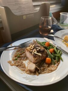 After this flurry there’s a welcome break in the action. A delicious dinner, fresh from the dining car’s galley, arrives in Roomette 14. The pan-roasted chicken breast with wild mushroom risotto, English peas, and Parisian carrots smothered in a morel mushroom sauce tastes every bit as good as it sounds. It’s a far cry from the microwaved meals Amtrak inflicted on you earlier in the pandemic.