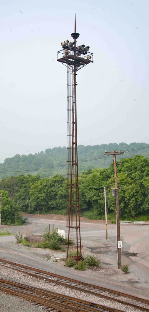 One tower would be placed near the east side of the museum’s quarter-roundhouse, and a second one, if feasible, would be placed west of there, near the turntable. “If we [restore] more than one, we’ll do one with the Altoona [simplified yard] configuration, and the second one we’d like to do in the World’s Fair configuration,” with multiple rings of lights fastened at intervals below the finials.