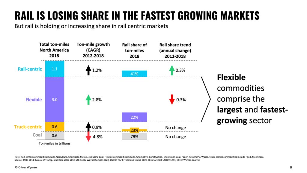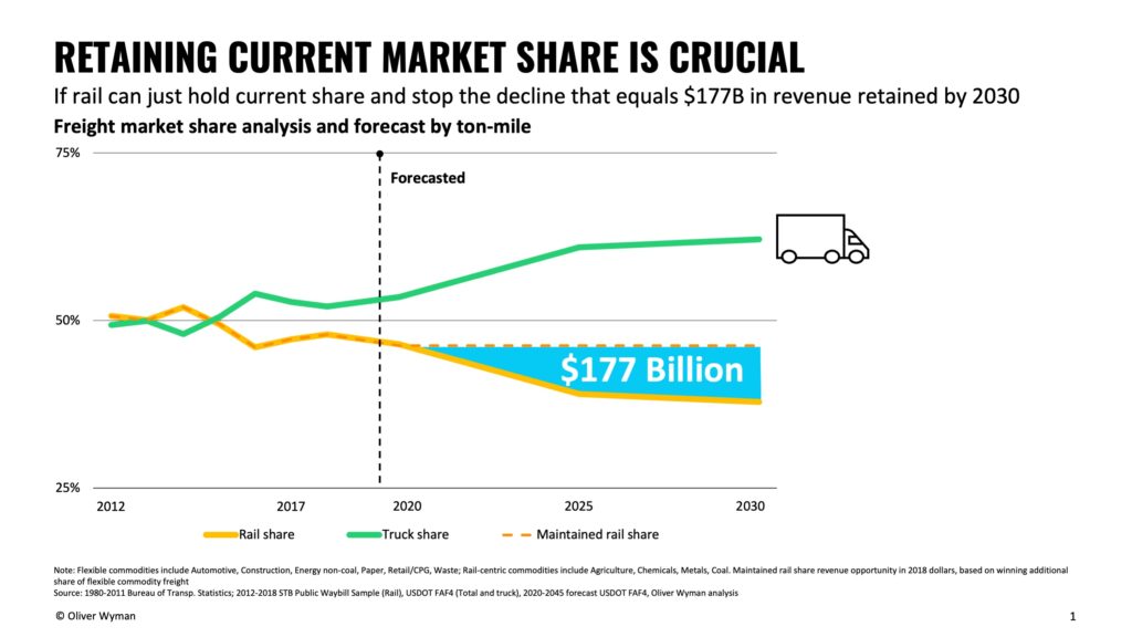 A study by consulting firm Oliver Wyman found that rail is losing share in the fastest-growing freight segments, which includes traffic like autos that can move by truck or rail. If the current trends continue, the truck versus rail gap would widen and railroads would lose $177 billion in revenue by 2030. Oliver Wyman concluded that to hang on to volume, railroads would have to become more reliable, provide shipment visibility, and become easy to work with while becoming supply chain partners.