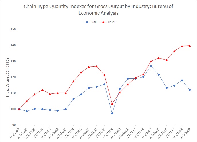 Miller points to the rail and truck trend lines in Bureau of Economic Analysis figures beginning in 1997. “Looking at these data, rail output was flat from 1997 through 2003 despite truck transportation ticking upward. Rail then had a nice jump in the mid 2000s, which corresponds to the strongest industrial production of manufacturing excluding computers,” he says. “The Great Recession hammered both modes, but rail grew just as rapidly as truck before falling in 2015, which is due to the joint downturn of coal mining and hydraulic fracking. As such, the slower growth seems more a function of the changing nature of economic activity.”