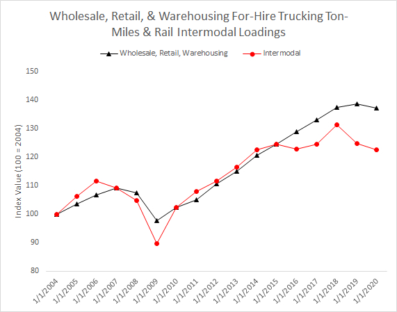 When you break out intermodal separately versus trucks that haul consumer goods, a similar trend emerges. Intermodal grew faster immediately after the Great Recession, and then grew in tandem with trucking until 2015. Then trucks take over.