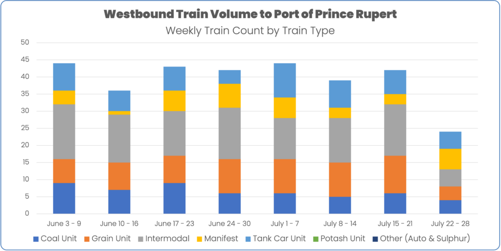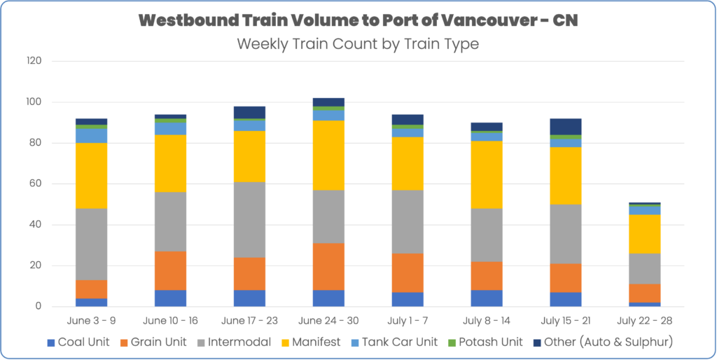 RailState monitors the Edson Subdivision at Hinton, Alberta, some 50 miles east of Jasper. “For the first two weeks of July, an average of 19 trains per day moved eastbound and 17.5 moved westbound through this subdivision.” RailState said. “On Sunday, July 28, RailState sensors captured 18 eastbound trains and 15 westbound trains through this area.”