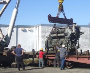 A prototype diesel engine built for use in a General Electric test locomotive has been declared an Historic Mechanical Engineering Landmark by the American Society of Mechanical Engineers’ National History & Heritage Committee. The 1,200-hp Cooper-Bessemer FVAL8T engine is the sole survivor of four used in GE’s A-B-B-A test locomotive No. 750, which operated on the Erie Railroad from 1954 to 1957. One A and B unit had the FVAL8T, while the other two units had 1,600-hp FVAL12T engines. The tests confirmed the engine was suitable for use in GE’s entry into the domestic locomotive market, becoming the GE 7FDL engine with the introduction of the U25B. The preserved engine was returned to Cooper-Bessemer after the test locomotive concluded operations and was used to run an air compressor at a Mount Vernon, Ohio, factory for several decades before being acquired by the Lake Shore Railway Historical Society in North East, Pa., near Erie, which specializes in rolling stock and artifacts related to GE locomotive production. The engine is current stored by the society and not on public view, with hopes of receiving public donations to place it on display sometime in 2021. Still to come is an official declaration of the engine’s status, along with a bronze plaque denoting the status and a citation on the AMSE’s historical landmark web page.
