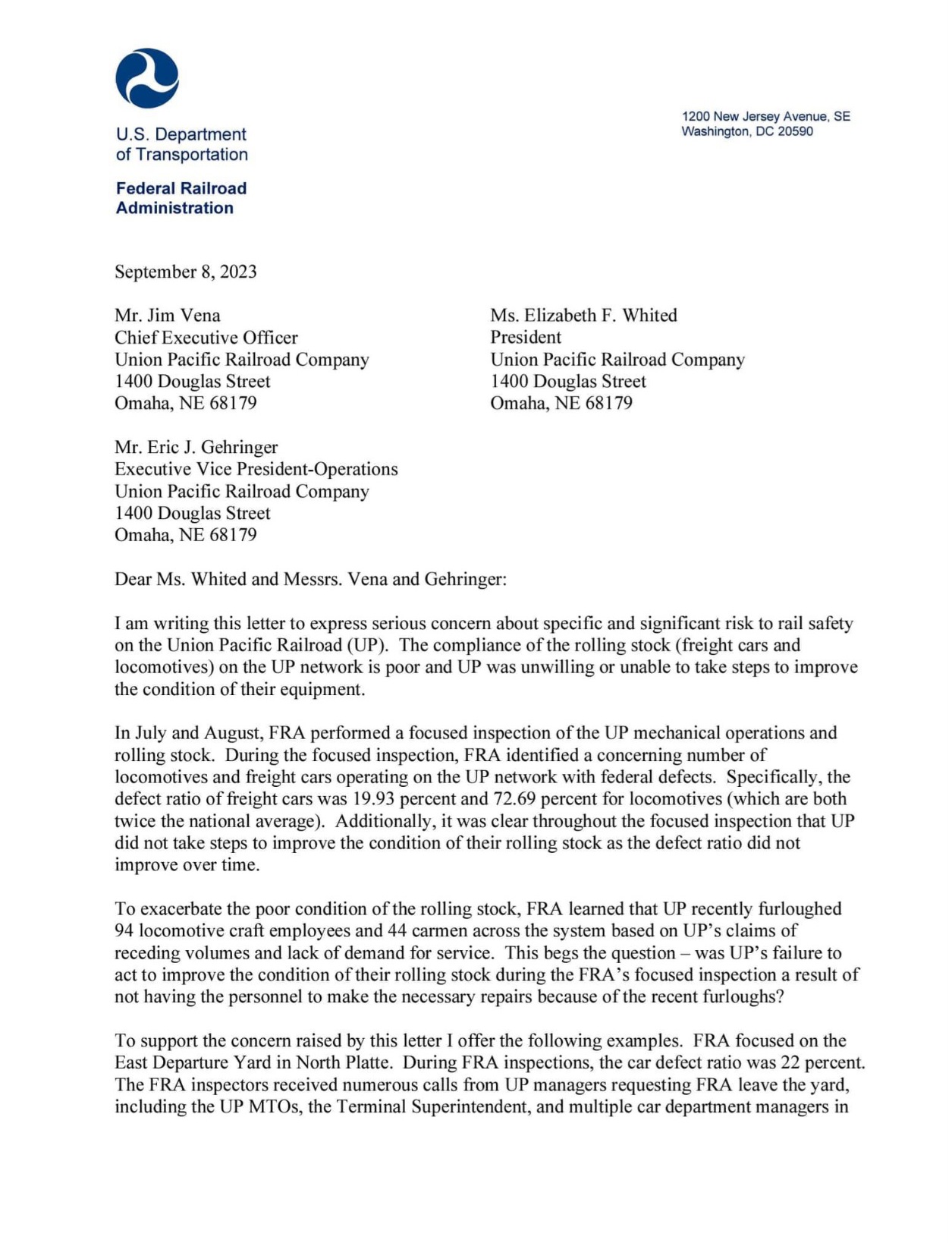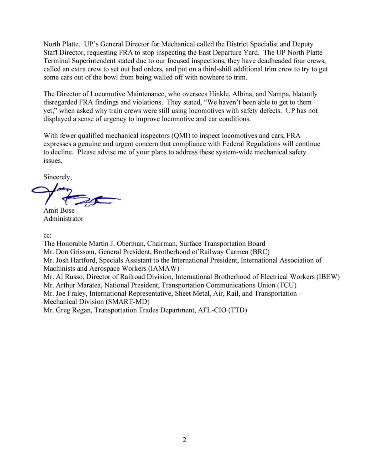 “UP has not displayed a sense of urgency to improve locomotive and car conditions,” Bose wrote. “With fewer qualified mechanical inspectors to inspect locomotives and cars, FRA expresses a genuine and urgent concern that compliance with Federal Regulations will continue to decline. Please advise me of your plans to address these systemwide mechanical safety issues.”